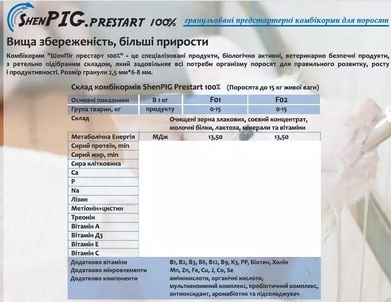 Пропонуємо Вам професійні, збалансовані за протеїновим, енергетичним, амінокислотним, вітамінним та мінеральним складом предстартерні комбікорми для поросят. Потужні та безпечні комбікорми «ShenPig» - це поєднання інноваційних Датських технологій, натуральності та безпечності, досвіду досліджень і новітніх розробок, ефективності і користі, а також простоти використання кінцевим споживачем в сучасному тваринництві. Увага до деталей, стабільність і використання новітніх технологій – наші ключові принципи роботи